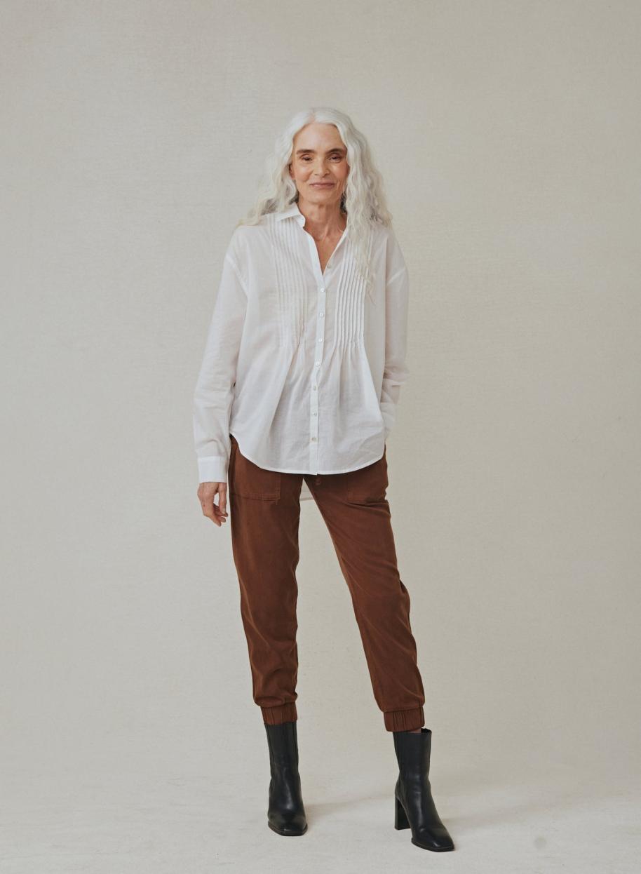 The Pintuck Flowy Shirt's design gives it a unique and fashionable look, perfect for both casual and formal occasions. With long sleeves and a tuxedo-inspired appearance, this shirt is a versatile and timeless addition to any wardrobe. 100% Cotton
