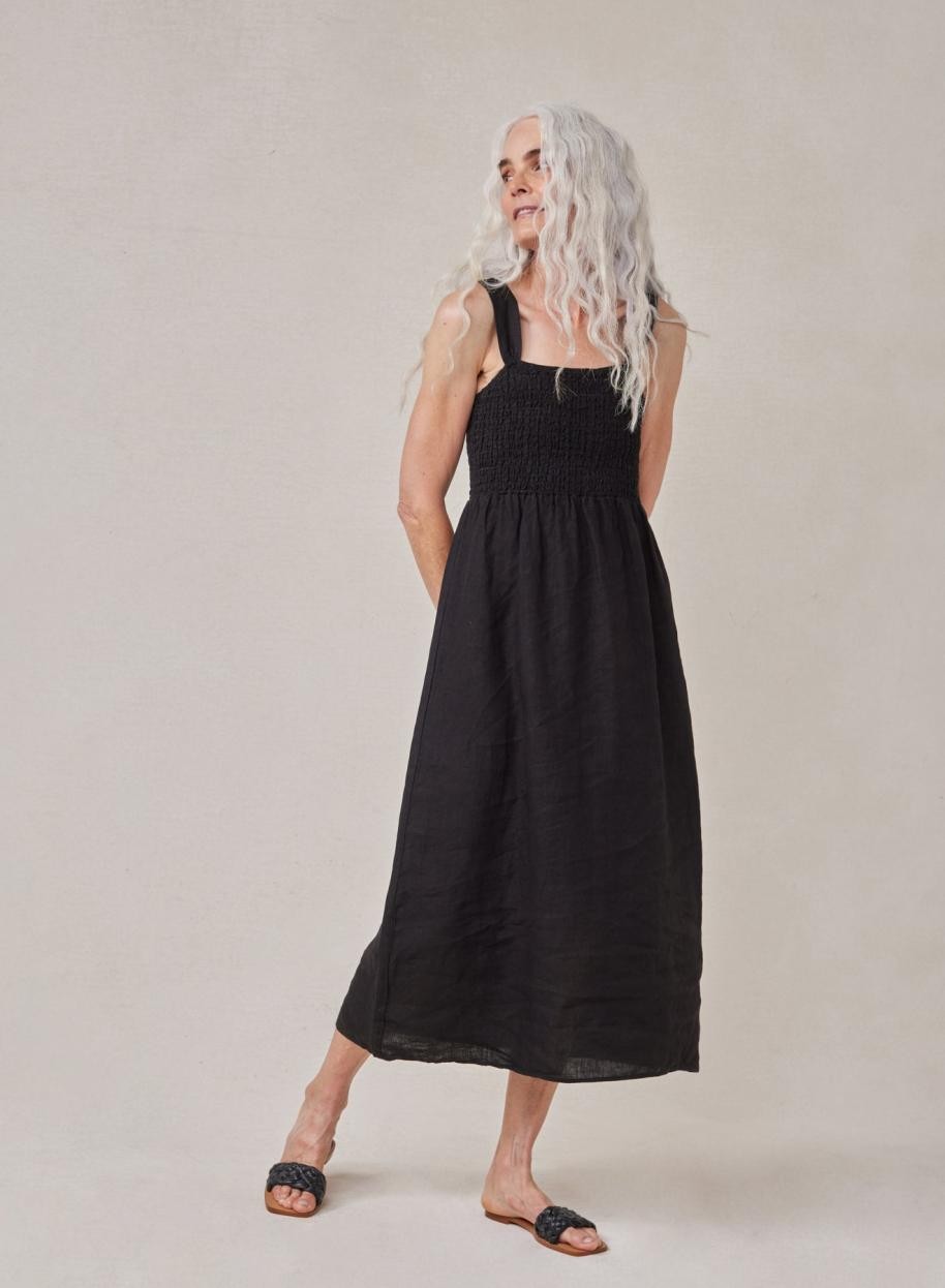 Öleld magaddal ennek a fekete midi ruhának a könnyed stílusát és időtlen vonzerejét, amely kötelező darab a ruhatáradban. Tökéletes a melegebb napokra. 100% lenvászon.