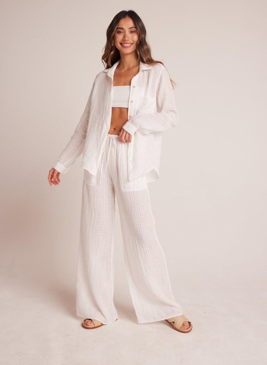 ワイドレッグポケットビーチパンツで、夏の美しさを満喫しましょう。気取らないシックさと無限の汎用性を兼ね備えたこのパンツは、ゆったりとしたワイドレッグシルエットが体に優しくフィットし、美しく快適な着心地を提供します。ギンガムチェックの生地が、タイムレスな魅力を全体に添えています。素材:リネン78%、コットン22%。