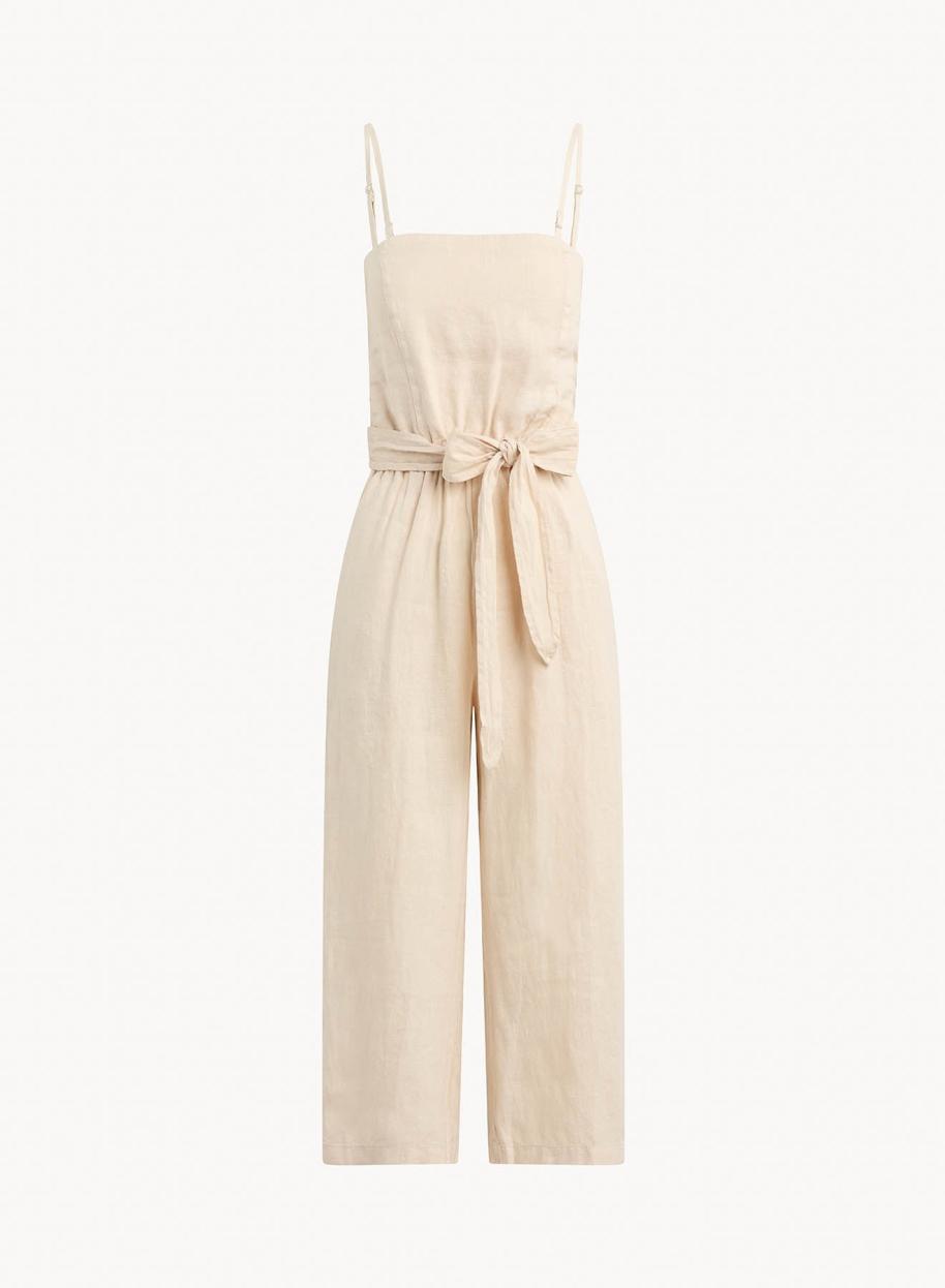 The Smocked Back Jumpsuit, designed from high-quality linen for a luxurious feel. This cropped length jumpsuit is perfect for any occasion, whether it be a daytime party or a night out on the town. Its versatile design allows for both casual and dressy styling options, making it a must-have addition to your wardrobe. 100% Linen