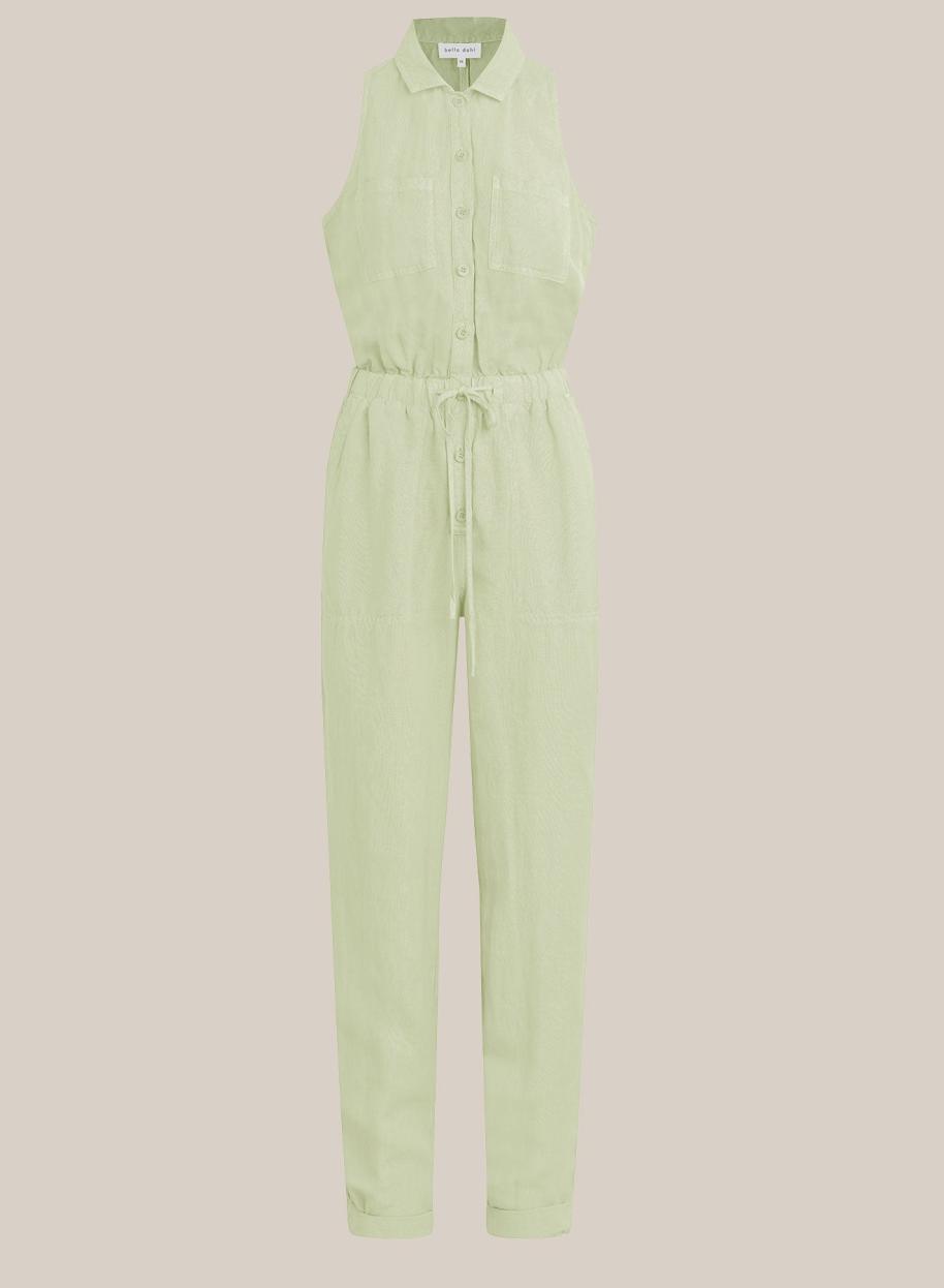 The Sunday Pocket Jumpsuit features a sleeveless design and a button front for an effortless look. Perfect for any occasion, this jumpsuit is a versatile and fashionable addition to your warmer weather wardrobe. 55% Linen 45% Rayon