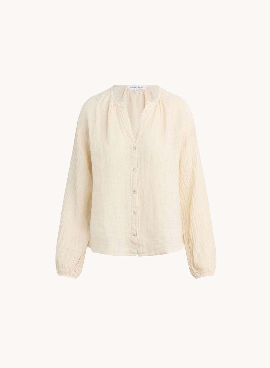 Elevate your wardrobe with our Shirred Neck blouse , designed for a flowy fit that is both breezy and comfortable. This fun and versatile top is perfect for any occasion, whether you're dressing up for a night out or keeping it casual for a day at the beach. Made from soft tissue linen. 100% Linen